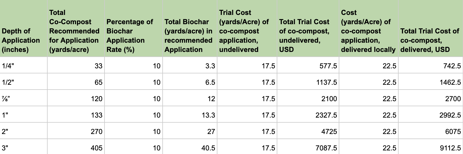 Biochar-enhanced compost (BEC) application methodology includes a liquid slurry, fertigation, top dressing, spreaders, injection, incorporation, and others as determined by the landowner. Top dressing requires a ¼” to ½” compost amendment. Production crops and cover cropping require a 1/2” to 3” compost amendment, with a typical rate of 2” or less. Containerized growing with biochar-amended soil requires a 5-25% Biochar volume, depending on crop type. For the purposes of our 2024 Biochar Scale-Up project, we have identified an application rate of 10% and 12 yards per acre of biochar as optimum, requiring a co-compost total application of 120 yards per acre. The table below serves as a reference point for our recommended application depths, rates, and consumer costs for biochar-enhanced compost during the duration of our scale-up trials.